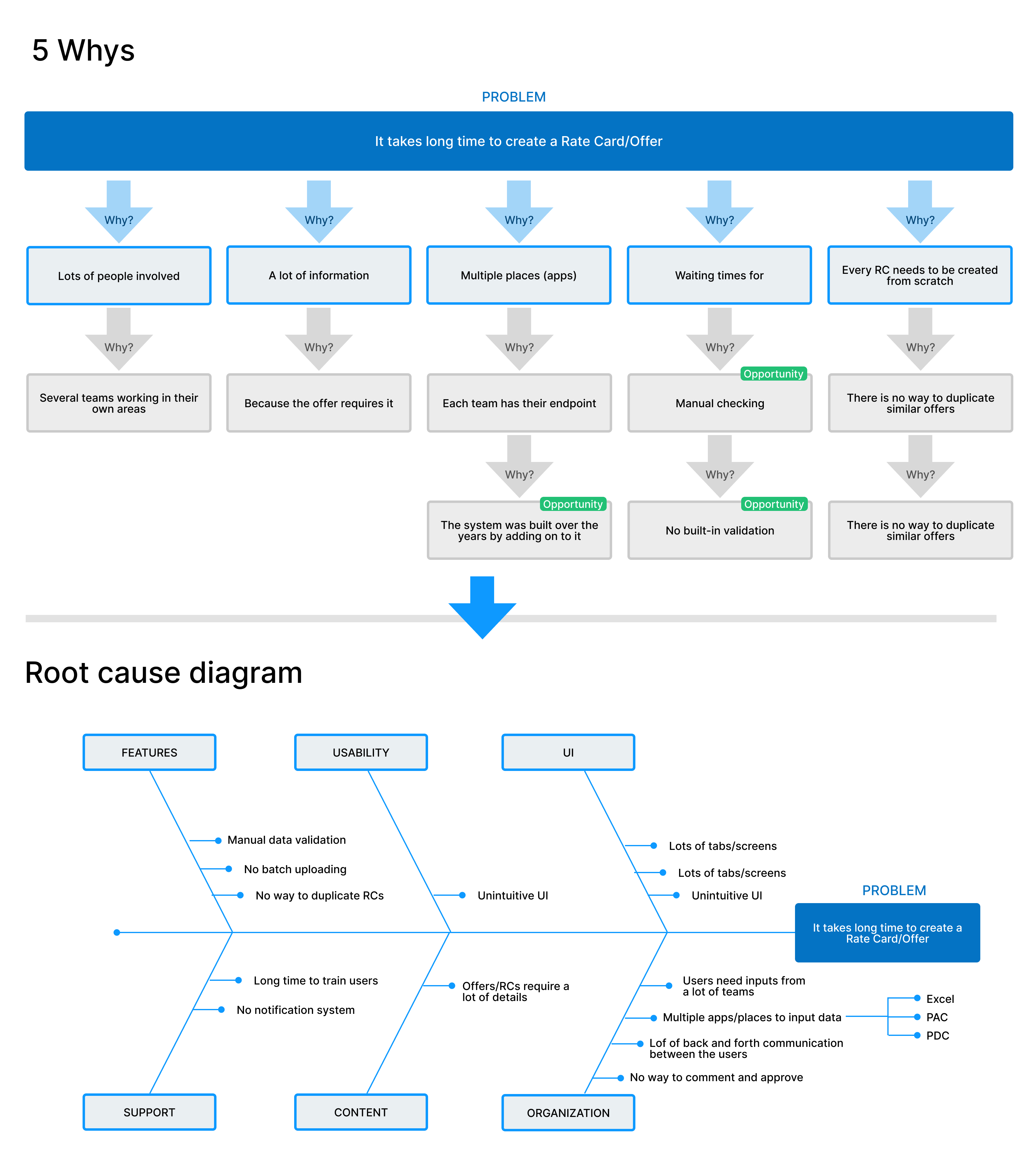 In order to identify possible causes of our problems, in talking with users I applied a '5 Why's ' method, which I find very powerful especially paired with a Fishbone diagram. This combination is extremely powerful in revealing bottlenecks and areas of weakness in a process, and the diagram itself is inavaluable in presenting to team members and stakeholders.